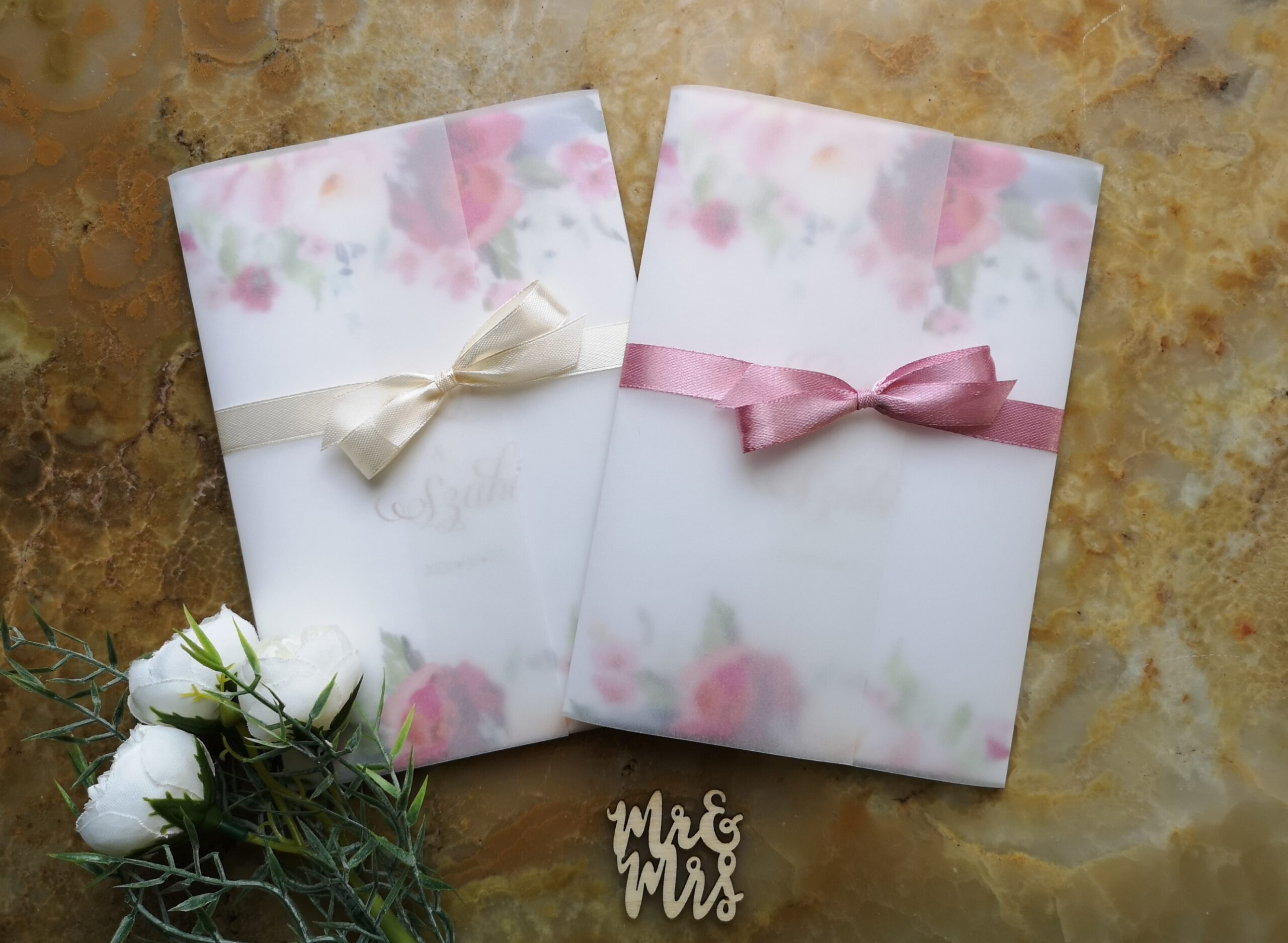 Anyaga: Prémium 240 gr fehér kreatív papír, díszítése selyem szalaggal, és pausz papír borítóval